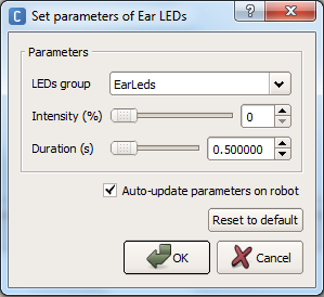 6. Click on the wrenches to set each box’s parameters. Choose an appropriate duration (in seconds), and make the intensity 100% in the first box and 0% in the second box. This will make the lights blink continuously. For the eye LEDs, you can double click on the boxes to select colors.