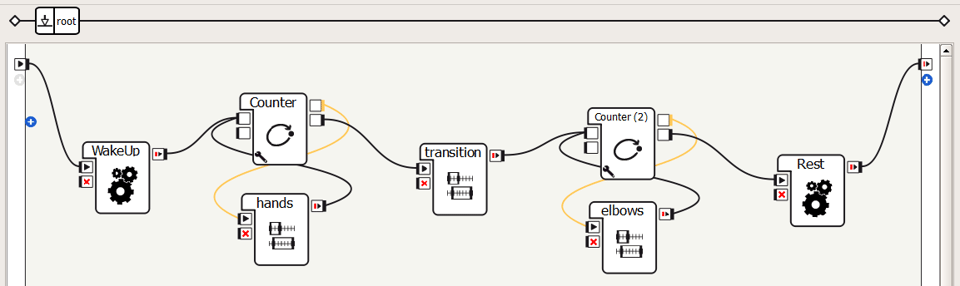 Show the students what happens if you don’t include a transition box. See the lesson3_2 Choregraphe file for an example. Encourage students to come up with two motions for the arms and transition between them.
