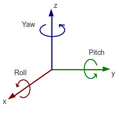 The terms yaw, roll and pitch refer to the orientation of the axis of rotation of each motor. Refer to the diagram on the right or below.