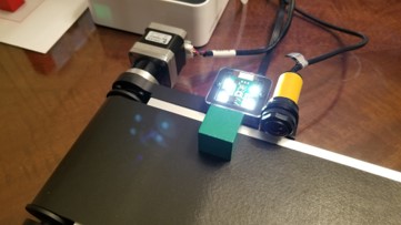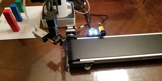 In this example we coded Dobot to sense when the cube passes through the photolectric sensor and stop the belt .5 seconds later. This places the cube right in front of the color sensor.